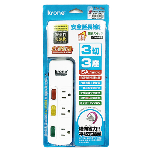 KRONE 立光 3孔3燈3座 耐熱阻燃 延長線 180cm SH4-090