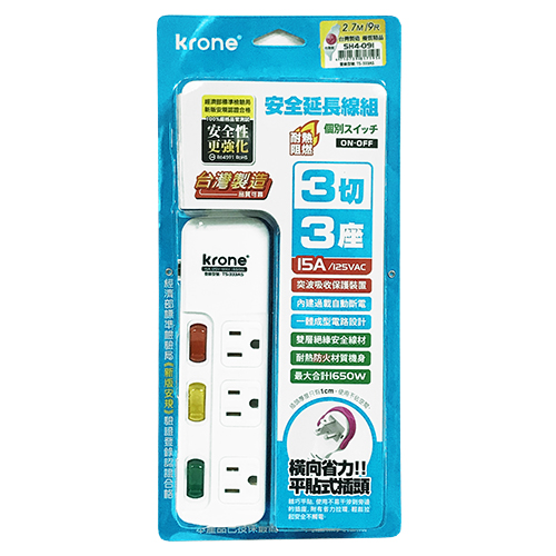 KRONE 立光 3孔3燈3座 耐熱阻燃 延長線 270cm SH4-091
