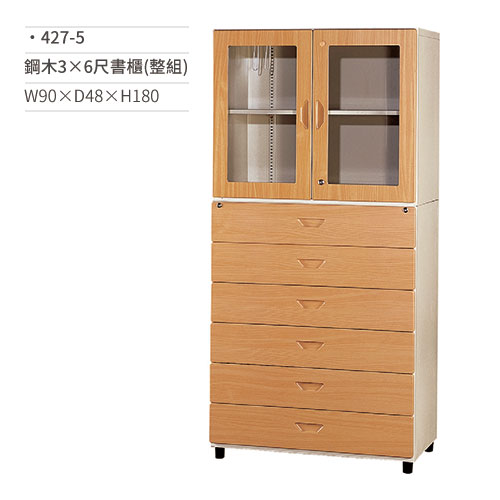 鋼木3×6尺書櫃(整組/開門二層六抽屜)427-5 W90×D48×H180