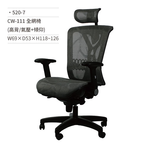 高級網椅/辦公椅(高背/有扶手/氣壓+傾仰)520-7 W69×D53×H118~126