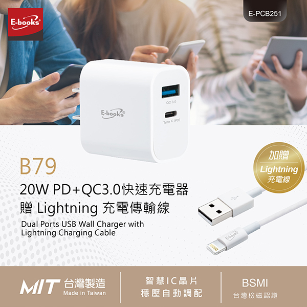E-books B79 20W PD+QC3.0快速充電器贈 Lightning 充電傳輸線1.2M 充電頭/豆腐頭