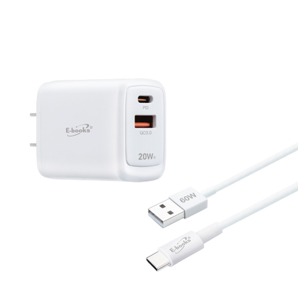 E-books B60 高效能 20W PD+QC3.0 雙孔快速充電器
