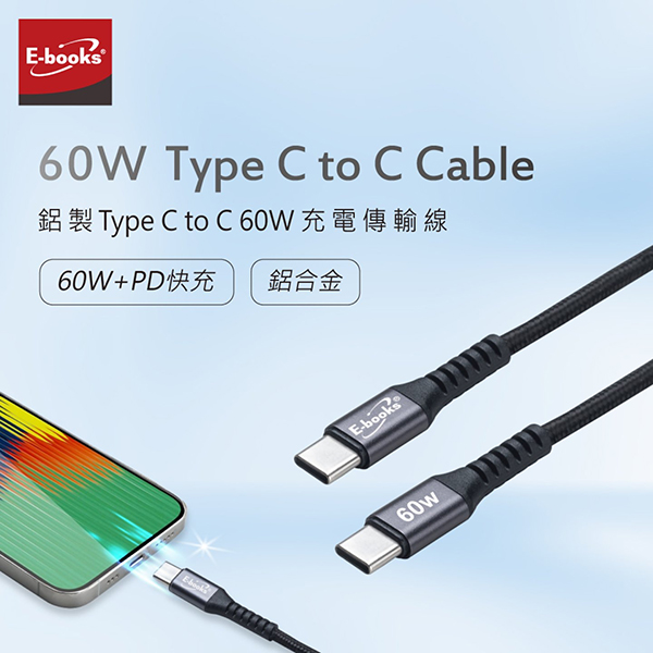 E-books XA60 鋁製Type C to C 60W充電傳輸線-2M