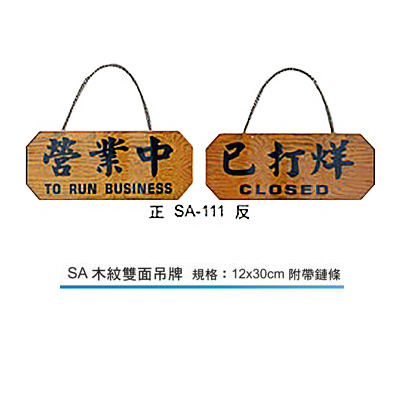 SA-111 營業中.已打烊 橫式 12x30cm 雙面木紋貼皮標示牌/指標/標語/吊牌 附鏈可掛