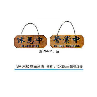 SA-113 休息中.營業中 橫式 12x30cm 雙面木紋貼皮標示牌/指標/標語/吊牌 附鏈可掛