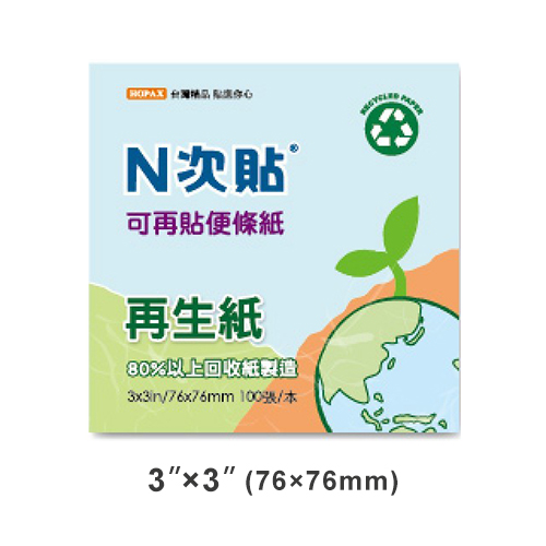 StickN N次貼 3x3 再生紙可再貼便條紙/便利貼 綠 76x76mm 100張入 NO.61911
