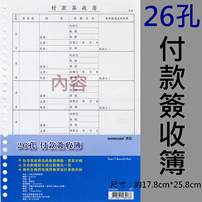 NANKUAN 南冠 26孔付款簽收簿內頁/活頁紙 M16018 適用26孔夾