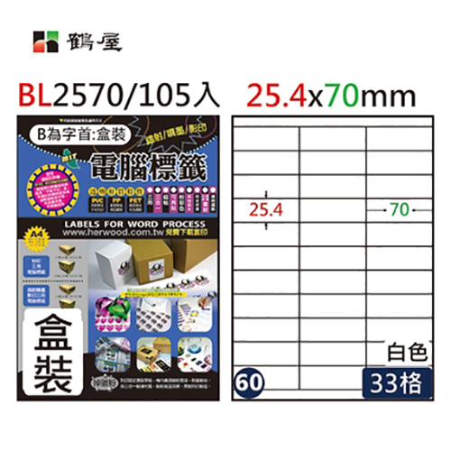 Herwood 鶴屋牌 33格 25.4x70mm NO.BL2570 A4雷射噴墨影印自黏標籤貼紙/電腦標籤 105大張入