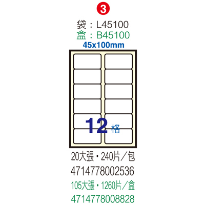 Herwood 鶴屋牌 12格 45x100mm NO.B45100 A4雷射噴...