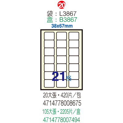 Herwood 鶴屋牌 21格 38x67mm NO.B3867 A4雷射噴墨影...