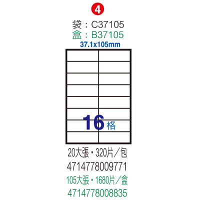 Herwood 鶴屋牌 16格 37.1x105mm NO.B37105 A4雷射噴墨影印自黏標籤貼紙/電腦標籤 105大張入