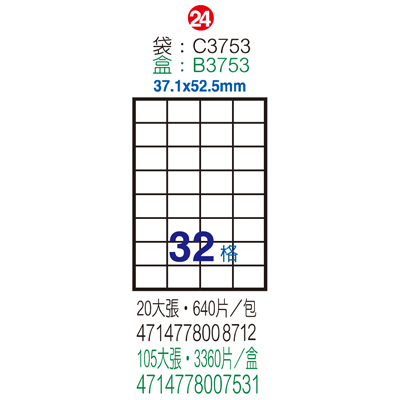 Herwood 鶴屋牌 24格 37.1x70mm NO.B3770 A4雷射噴...