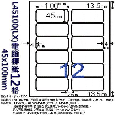 Herwood 鶴屋牌 12格 45x100mm NO.L45100 A4雷射噴...