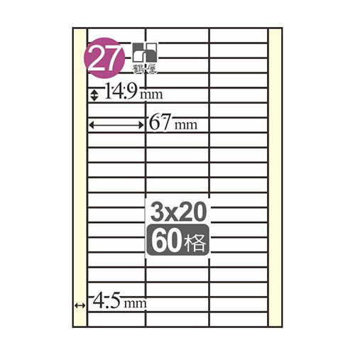 Herwood 鶴屋牌 60格 14.9x67mm NO.A1567 A4高溫快速三合一雷射噴墨影印自黏標籤貼紙/電腦標籤 20大張入