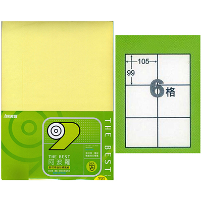 阿波羅 105×99mm NO.9206Y 6格 淺黃 A4 雷射噴墨影印自黏標籤貼紙 20大張入