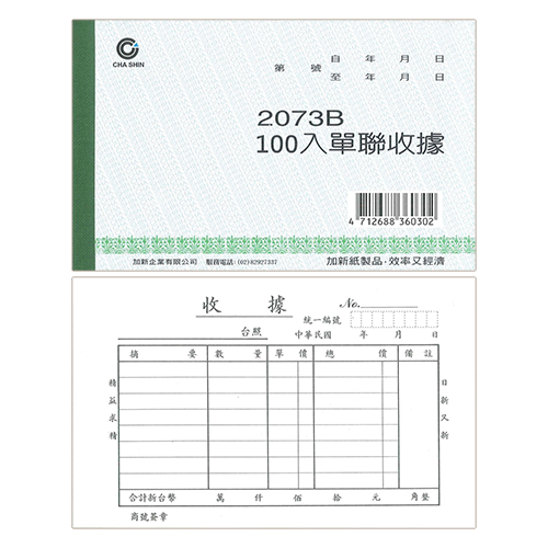 CHA SHIN 加新 2073B 單聯收據 100入 152×95mm