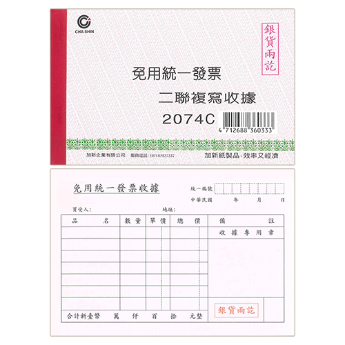 CHA SHIN 加新 2074C 非碳二聯收據免用統一發票 152×95mm