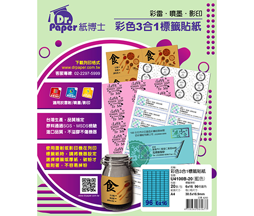 Dr.Paper 30.5x16.9mm 切圓角 NO.96-U4100B-20 96格 藍 A4 雷射噴墨影印自黏標籤貼紙/電腦標籤 20大張入