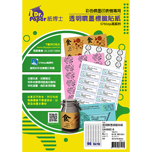 Dr.Paper 30.5x16.9mm 切圓角 NO.96-U4100C-5 96格 透明 A4 雷射噴墨影印自黏標籤貼紙/電腦標籤 5大張入