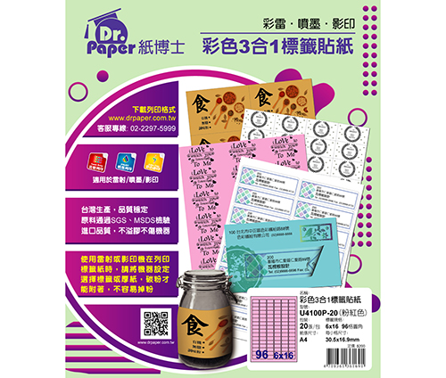 Dr.Paper 30.5x16.9mm 切圓角 NO.96-U4100P-20 96格 粉紅 A4 雷射噴墨影印自黏標籤貼紙/電腦標籤 20大張入