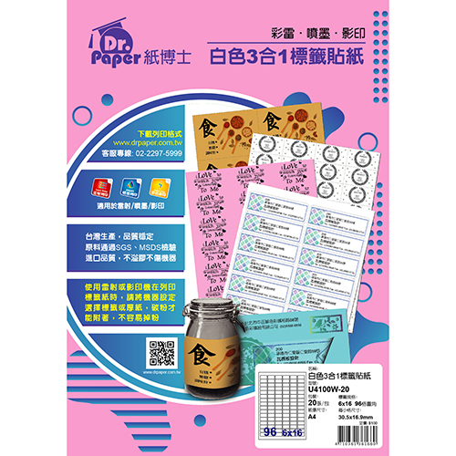 Dr.Paper 30.5x16.9mm 切圓角 NO.96-U4100W-20 96格 A4 雷射噴墨影印自黏標籤貼紙/電腦標籤 20大張入