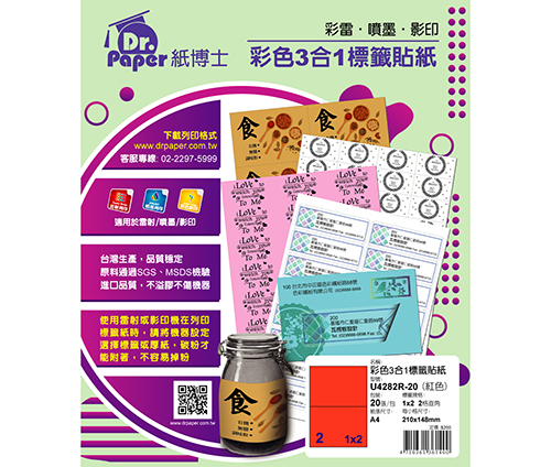 Dr.Paper 210x148mm NO.2-U4282R-20 2格 紅 A4 雷射噴墨影印自黏標籤貼紙/電腦標籤 20大張入