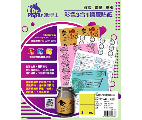 Dr.Paper 210x148mm NO.2-U4282Y-20 2格 黃 A4 雷射噴墨影印自黏標籤貼紙/電腦標籤 20大張入