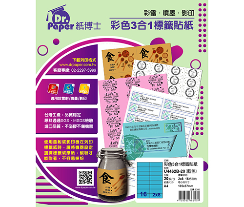 Dr.Paper 105x37mm NO.16-U4462B-20 16格 藍 A4 雷射噴墨影印自黏標籤貼紙/電腦標籤 20大張入