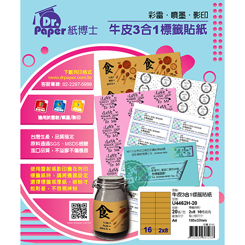 Dr.Paper 105x37mm NO.16-U4462H-20 16格 牛皮 A4 雷射噴墨影印自黏標籤貼紙/電腦標籤 20大張入