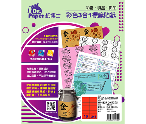 Dr.Paper 105x37mm NO.16-U4462R-20 16格 紅 A4 雷射噴墨影印自黏標籤貼紙/電腦標籤 20大張入