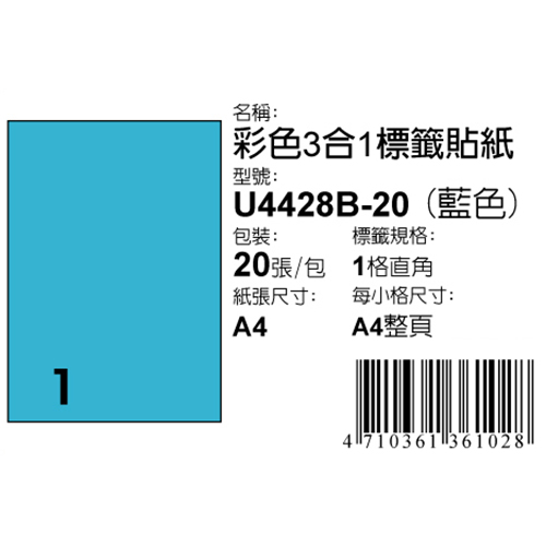 Dr.Paper NO.1-U4428B-20 全張 藍 A4 雷射噴墨影印自黏標籤貼紙/電腦標籤 20大張入