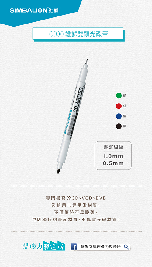 光碟萬用筆可書寫於CD、VCD、DVD、信用卡、玻璃…等平滑材質,耐水、耐光、書寫後速乾,且不會因長期未使用而墨水乾枯,共有紅、藍、黑及綠四色。產品說明專門書寫於CD、VCD、DVD及信用卡等平滑材質,不僅筆跡不易脫落,更因獨特的筆蕊材質,不傷害光碟材質。