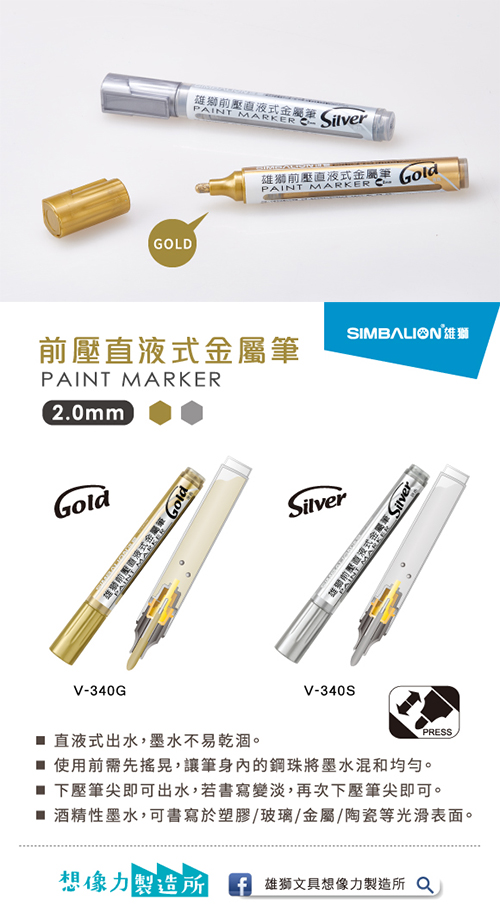 產品特色環保顏料,耐水、速乾、不易褪色,可書寫於大部份材質表面,鮮豔的色系與特殊金屬色,讓您可在各種生活飾品、卡片上發揮創意,彩繪出獨一無二的生活風格。產品說明可書寫於塑膠、玻璃、金屬、陶瓷、光碟、木材、紙張等大部份材質表面,於深色紙張使用效果更佳。