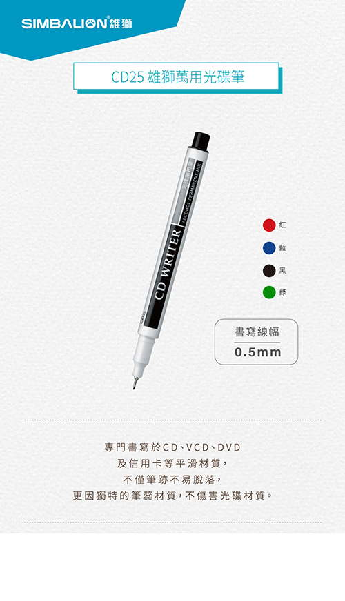 規格 : 0.5mm產品特色 :光碟萬用筆可書寫於CD、VCD、DVD、信用卡、玻璃…等平滑材質,耐水、耐光、書寫後速乾,且不會因長期未使用而墨水乾枯。產品說明 :專門書寫於CD、VCD、DVD及信用卡等平滑材質,不僅筆跡不易脫落,更因獨特的筆蕊材質,不傷害光碟材質。