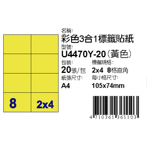 Dr.Paper 105x74mm NO.8-U4470Y-20 8格 黃 A4 雷射噴墨影印自黏標籤貼紙/電腦標籤 20大張入