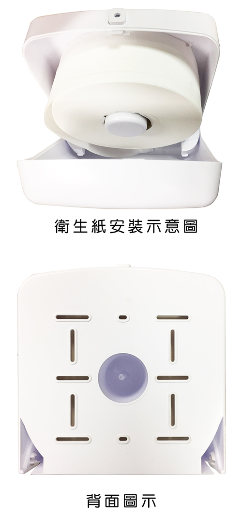 BLOSSOM BL-0304A 大捲筒衛生紙架規格:■ 架體尺寸 : 120 (深) x 270 (寬) x 283 (高) 毫米■ 架體重量 : 577 公克■ 架體材質 : 丙烯?-丁二烯-苯乙烯 (簡稱ABS)■ 架體容量 : 1 捲■ 紙張使用 : 大捲筒衛生紙■ 包裝 : 10 台/箱■ 其它配件 : 螺絲包產品特色:■ 使用 : 將核心配件取下後、 可選擇使用較小筒心之衛生紙※版面圖案依廠商隨機出貨。