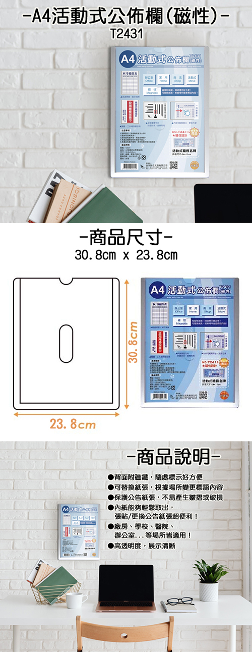 尺寸: 30.8x23.8cm▶背面附磁鐵,隨處標示好方便▶可替換紙張,根據場所變更標語內容▶保護公告紙張,不易產生皺摺或破損。▶內紙能夠輕鬆取出,張貼/更換公告紙張超便利!▶廠房、學校、醫院、辦公室...等場所皆適用!▶高透明度,展示清晰