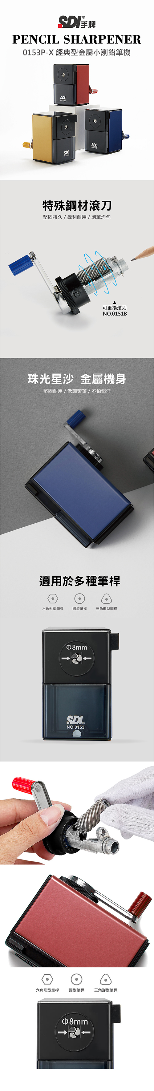 產品特色 :質感金屬星砂表面,兼具品味與時尚 整機金屬外殼,堅固又耐用 適用於一般鉛筆(Φ 8mm),不適合削彩色鉛筆 可選購手牌 No. 0151B替換滾刀進行更換。規格尺寸 100(長) x 65(寬) x 100(高) mm隨機出色如需指定請於備註說明。