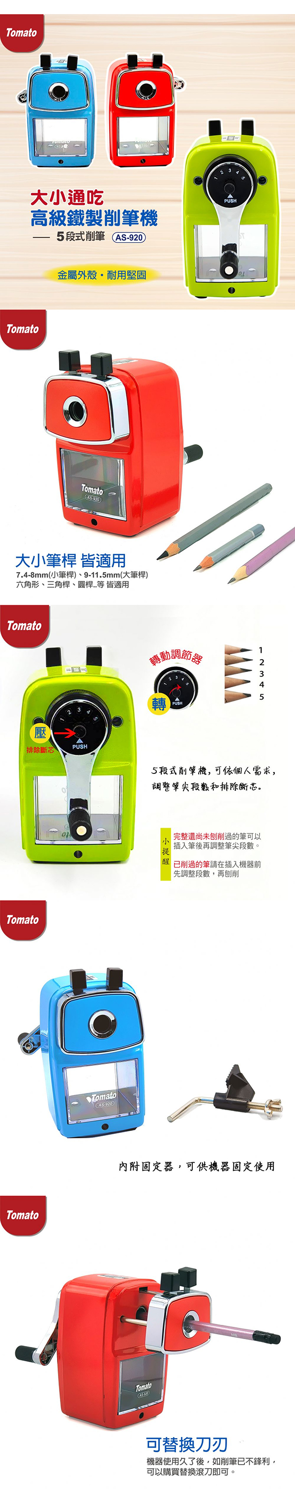 特色:* 五段式削筆機、可調整筆芯粗細* 大小通吃、可削六角形、三角形、圓桿(大)、圓桿(小) 各式鉛筆* 金屬外殼.耐用堅固* 自動排除斷芯功能.遇到筆芯斷掉.可按壓調節器排除斷芯 * 共三種顏色:綠.紅.藍*可替換刀刃.如削筆已不鋒利.可購買替換滾刀