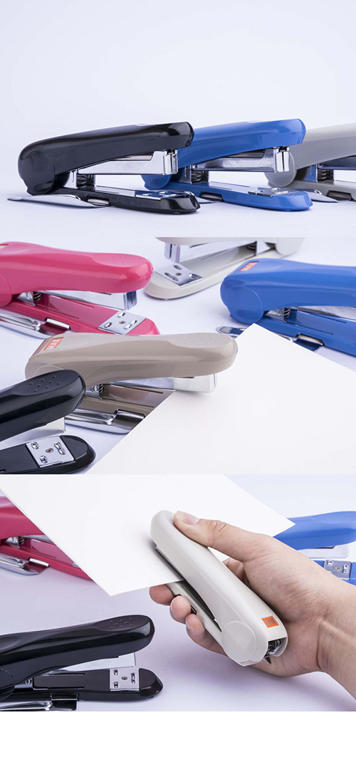 流線型的機身和握把,圓弧手感極佳,外層塑膠材質包覆精密金屬結構,是完美組合。只要輕輕扳開上蓋就能輕鬆補充釘書針,適用No.M8-1M型號,一次最多可裝訂30張紙。總共有黑、藍、紅、米、灰五色,亮麗色彩提升質感。側邊附有除針器小巧思,輕輕拉開即可。小巧的機身攜帶方便,放置辦公室也好收納,是日常使用必備。