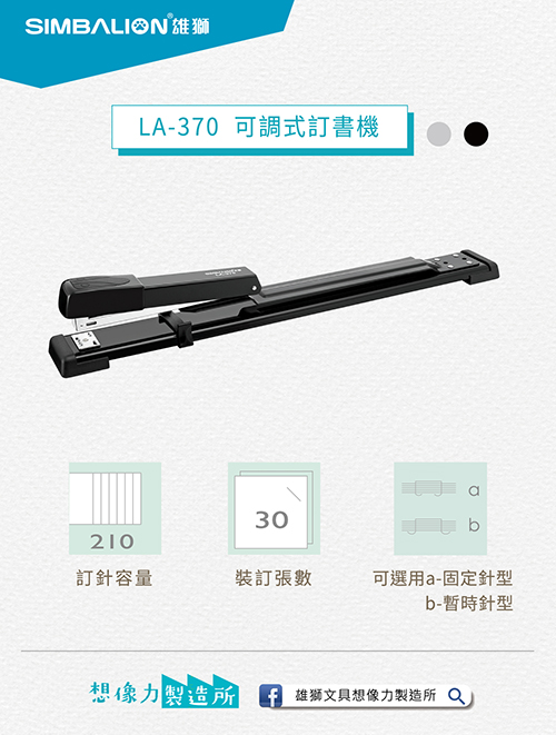 ◎ 可調式裝訂針型,可選擇向內彎針之固定針型,或向外彎針之暫時針型、可調整裝訂之針型,用於大份量文件之裝訂