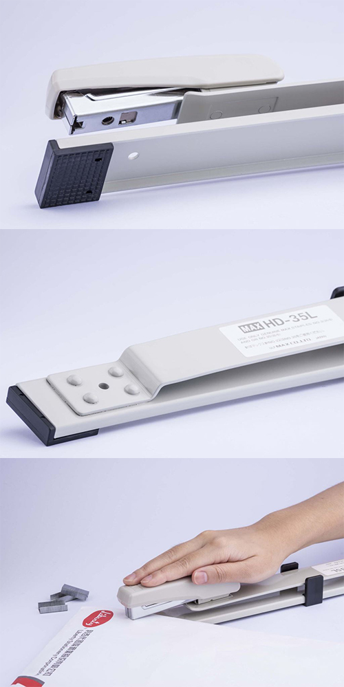 符合跨接頁的裝訂需求,這款長臂型釘書機可輕鬆完成手冊型的文件,例如:四合一小冊子只要四個釘就能一氣呵成,無需旋轉頁面。對於一般釘書機釘不到的地方,更是方便好用。前置式上匣補針,No.35-2號針容量100支、No.3號針容量50支,貼心的卡針排除設計,提升工作效率。全鋼鐵材質外殼,堅固耐用,事務用品專業之選!