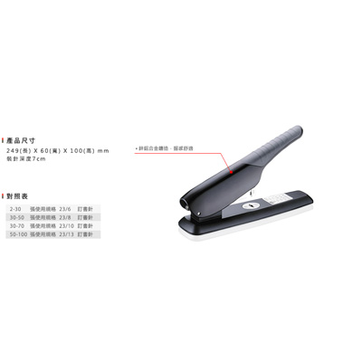 規格尺寸 : 最大裝訂深度65mm.最大紙張裝釘量2-100張.
