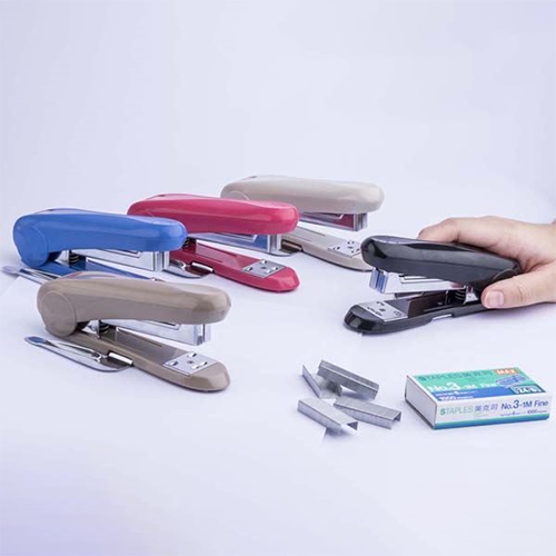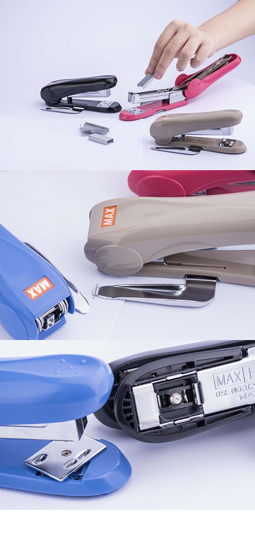 另一項特殊功能為可調整釘法選項,透過釘書機下方按鈕選擇暫時性與永久性釘法,釘書針的釘腳依需求變化。釘匣填充容量共50枚,適用No.3號針,另附除針器。除針器從側身拉出來,隱藏版的小設計簡化MAX-HD-50R釘書機的完美外觀,共有黑、藍、紅、灰、米色。