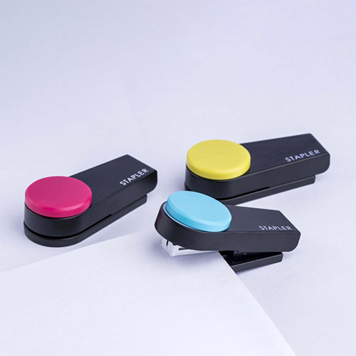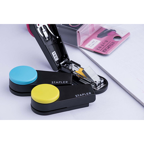 迷你手指釘書機造型輕巧,用色大膽,以黑底搭配天藍、檸檬黃、熱粉紅三種撞色的超大按鈕,不僅實用更散發時尚感強烈的青春魅力。超大撞色按鈕不只吸睛,功能性也相當強,是非常美麗的機關喔!只要輕輕往上推即可將釘書機本體闔上,機體變得平整且體積縮小,便於收納在筆袋裡隨身帶著走。裝釘書針時打開釘書機本體將按鈕往下壓,裝好後把本體往回壓即可使用,操作十分簡易方便。別看迷你手指釘書機像玩具一樣,一次可以釘10張70gsm影印紙,功能絲毫不遜於一般釘書機喔!