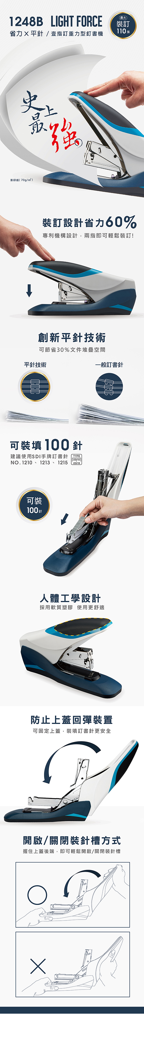 產品特色 :• 可裝訂70gsm,最大裝訂張數110張• 專利機構設計,省力60%裝訂更輕鬆• 握把符合人體工學設計,軟墊材質設計更提高使用的舒適感• 創新平針設計,文件堆疊空間可節省30%以上• 防止回彈裝置,裝填訂書針更方便 適用23/10.23/13.23/15針
