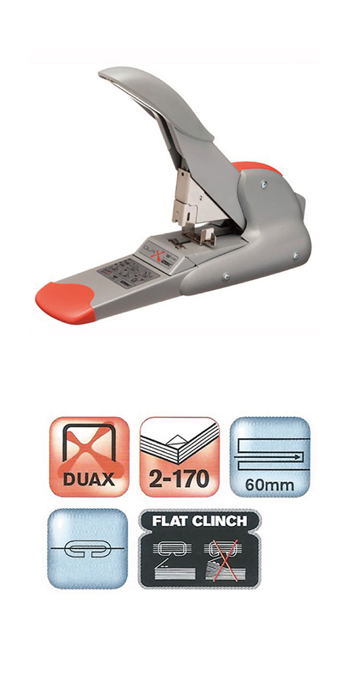 可隨紙張厚度自動裁切釘腳、全鋼材質、堅固耐用、裝訂厚度 2-170張,一針到底免換釘針 縱深 可達65mm,並具定位鎖 前方補針,一次可放兩排針 依紙張厚度自動裁切針腳 全鋼結構,塑鋼外殼 有斷針收集盒