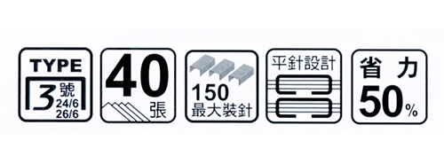 產品特色 :• 專利省力結構,比一般訂書機省力50%• 創新平針技術,可節省30%文件堆疊高度• 可放3排3號針(24/6,150針)或2排26/6針(200針),省時不需常更換• 可裝訂40張70g/m²影印紙,最適合多頁數文件 規格尺寸 :適用於3號(24/6或 26/6)訂書針