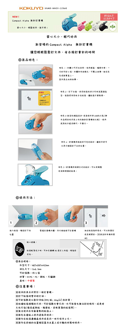 材質:R-PC、PC、鋼板、不銹鋼固定張數:PPC用紙約5張本體尺寸: W27*D87*H53mm開孔部分尺寸:5*6.5mm產地:中國※ 隨著紙張的不同,可裝訂張數可能會減少。對於較柔軟的紙類(如複寫紙、感熱紙等)裝訂的強度可能較弱。※ 請勿用於紙張以外的材質或沾有黏劑的物品。
