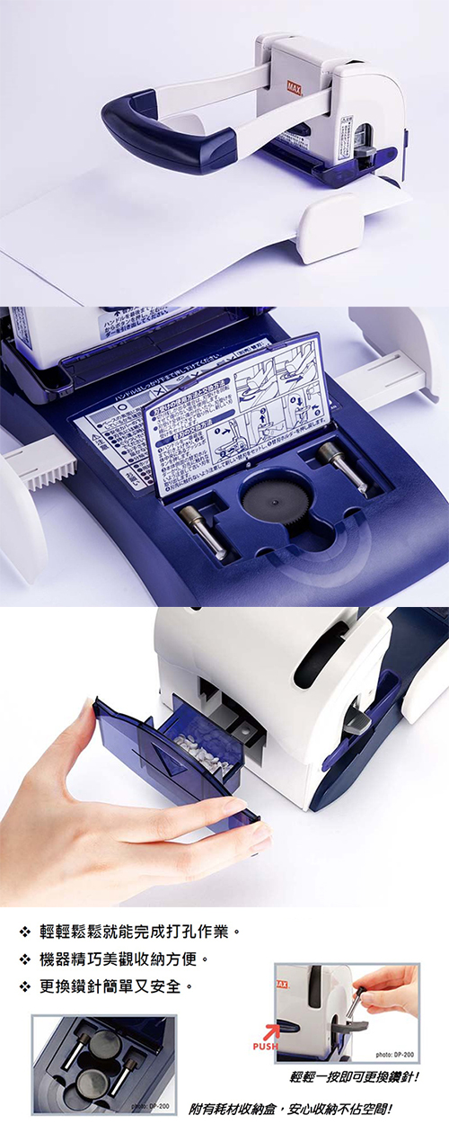 打孔機功能再進化,美克司 DP-120桌上型強力打孔機,以人體工學專業設計,體積與重量更加輕巧,一次打孔張數可達120張影印紙厚度!現在重量級的文件、企劃書、檔案資料、論文與原稿影本等等,只要放進DP-120──將大型超好握的舒適握柄輕輕一壓便能輕鬆打孔,不必分多次作業,一次即可順暢完成繁瑣累人的重量級文件打孔作業。